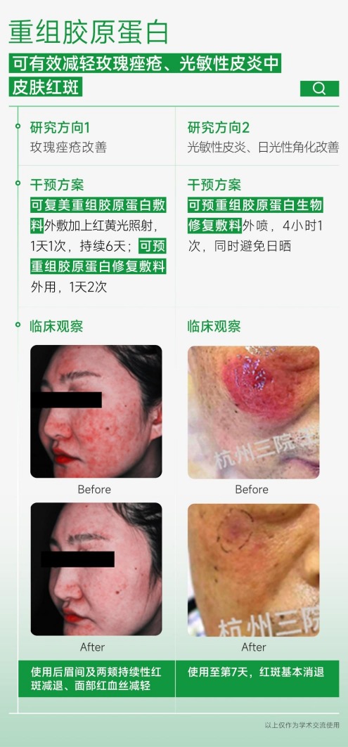 玫瑰痤疮及光敏性皮炎是常见的皮肤疾病,患者常出现严重红斑等泛红表征,皮肤屏障脆弱是核心发病机制之一,因此修复受损的皮肤屏障是治疗的关键。在皮肤科专家胡艺医生与王松医生的临床研究案例中,重组胶原蛋白对患者面部红斑均表现出显著改善效果,为该类皮肤疾病的临床治疗方案提供了有效参考思路。