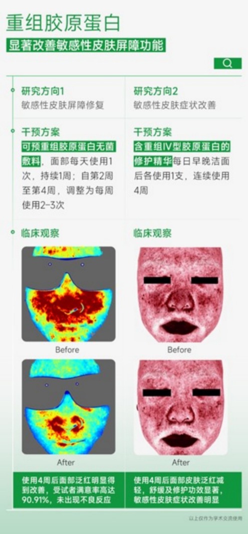 敏感性皮肤通常表现为面部在受到外界微小刺激后,出现灼热、泛红、刺痛等一系列不适感,其发生的关键环节在于皮肤屏障功能受损。皮肤科专家王曦教授的两项临床试验研究进一步证实,重组胶原蛋白卓越的舒缓、保湿、修护功效为敏感性皮肤的长期改善与日常养护提供了优异的解决方案。