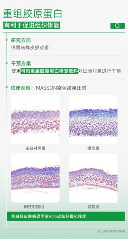 皮肤科专家杨猛教授针对重组胶原蛋白在银屑病样皮损的改善研究中发现,可预重组胶原蛋白修复敷料能减轻试验对象皮肤病理学变化与皮肤纤维化程度,进而有效帮助皮损改善。