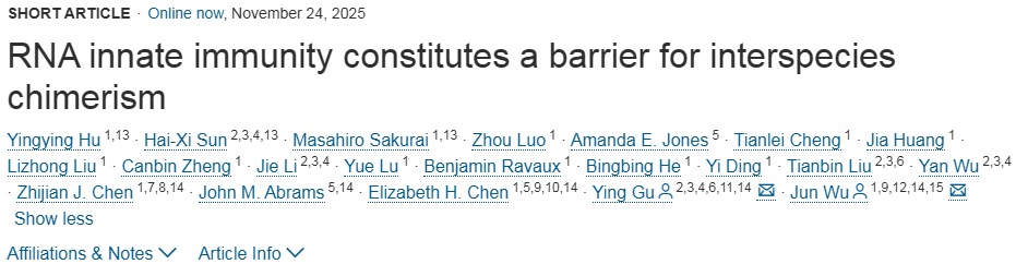 Yingying Hu et al, RNA innate immunity constitutes a barrier for interspecies chimerism, Cell (2025). DOI: 10.1016/j.cell.2025.10.039.
