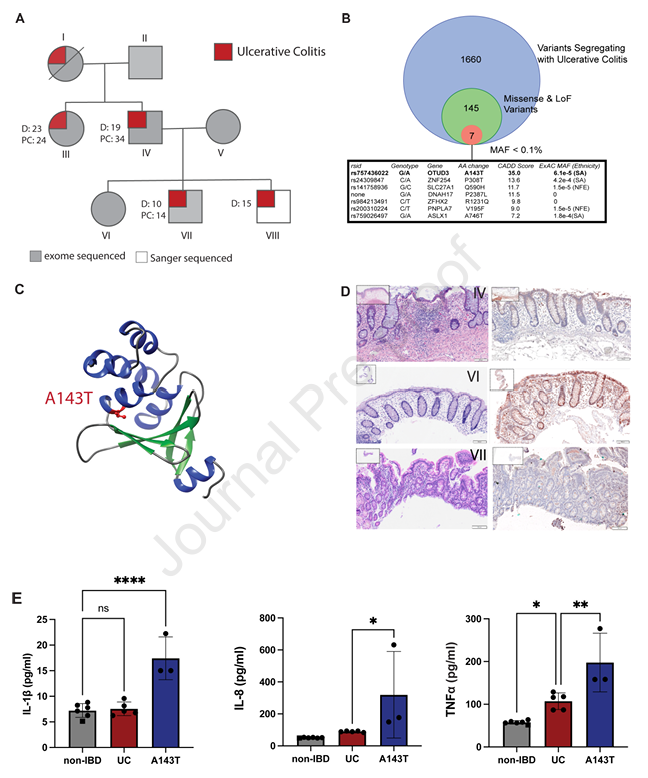 研究团队先盯上了一个特殊的南亚家庭——这个家族好几代人都受难治性溃疡性结肠炎折磨,很多人年纪轻轻(8到21岁)就发病,不少还得做结肠切除术才能控制。他们给家族里有病和没病的人都做了全外显子测序,最后锁定了OTUD3基因的一个突变——A143T。这个突变位于基因的保守区域,CADD评分高达35.0,这说明它的致病性相当强。更关键的是,家族里只有带这个突变的人会得结肠炎,没带的人都健健康康。而且这些患者的血清里,IL-1β、IL-8、TNFα这些促炎因子的水平,比普通溃疡性结肠炎患者和健康人都高不少。