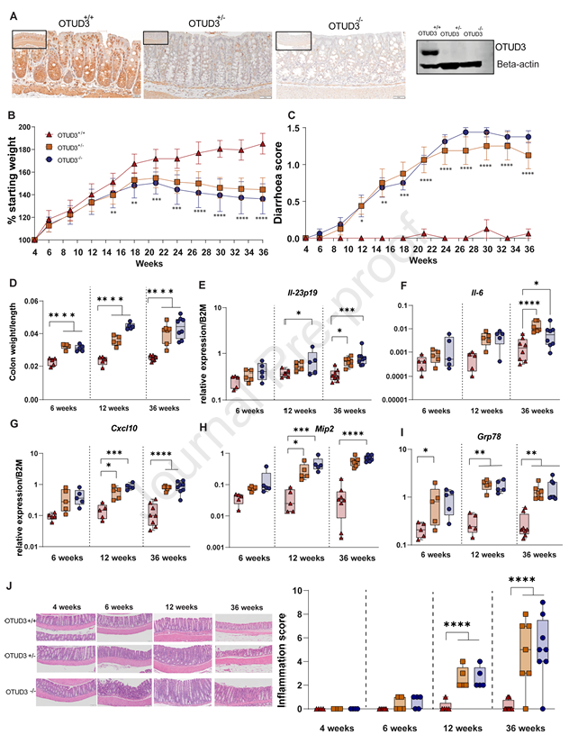 为了搞清楚这个突变到底有啥影响,研究人员构建了几种OTUD3基因异常的小鼠——有的全身敲除这个基因,有的是杂合子(只缺一个拷贝),还有的只在肠道上皮细胞里敲除。结果很明显:不管是哪种基因异常,小鼠都会自己长出结肠炎。6周大的时候,这些小鼠就开始拉肚子,结肠的重量和长度比例变高,肠道里还出现了免疫细胞浸润;随着年龄增长,症状越来越重,结肠组织里的促炎因子(比如Cxcl10、Mip-2)和内质网应激标志物Grp78,表达量都比正常小鼠高很多。