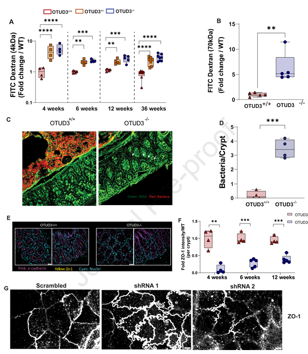 更重要的是,这些小鼠的肠道屏障早就“出问题”了——早在4周大的时候,也就是结肠炎还没表现出来的时候,它们的肠道就开始“漏”了。给小鼠喂了FITC-葡聚糖后,4kDa和70kDa两种分子量的葡聚糖,在它们血清里的浓度是正常小鼠的5倍左右;结肠里负责“密封”肠道的紧密连接蛋白ZO-1,位置也乱了套,肠道里的细菌甚至能跑到结肠隐窝深处。后来研究人员在人的结肠类器官上做实验,把OTUD3基因敲低后,ZO-1的染色也变得乱七八糟,这才确认,OTUD3对维持肠道“密封性”真的很重要。