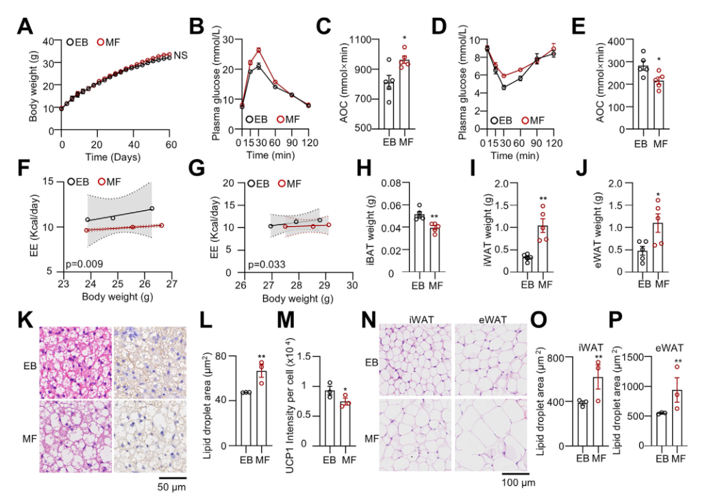 为了验证这种保护作用的持久性,研究人员在小鼠断奶后进行了高脂饮食挑战。结果令人惊喜:纯母乳喂养的小鼠展现出超强的“抗胖能力”,葡萄糖耐受性和胰岛素敏感性明显更好,能量消耗更高,身上堆积的白色脂肪也更少。