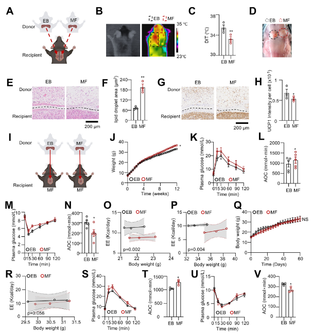 为什么母乳喂养的保护作用能持续这么久?研究团队提出了“产热记忆”的猜想,并通过棕色脂肪移植实验得到了验证。他们把纯母乳喂养和混合喂养小鼠的棕色脂肪,分别移植到受体小鼠体内,结果发现:来自母乳喂养小鼠的棕色脂肪,在12周内始终保持更强的产热能力,还能显著改善受体小鼠的体重增长和血糖控制。