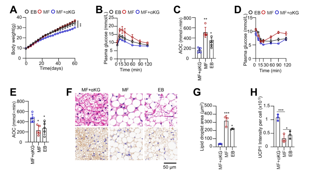 长期补充α-酮戊二酸,还能降低混合喂养小鼠在高脂饮食下的体重增长,改善葡萄糖耐受性和胰岛素敏感性,减少白色脂肪堆积,成功弥补了混合喂养带来的代谢缺陷。这一发现,为母乳喂养不足的家庭提供了切实可行的干预方向。