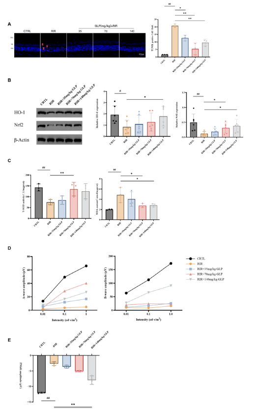研究团队以出生后6天的Sprague-Dawley大鼠为实验对象,通过前房灌注法构建视网膜缺血再灌注损伤模型,随后连续7天给予不同剂量的灵芝多糖灌胃干预,剂量分别为35、70和140 mg/kg/d。研究采用组织学、电生理、分子生物学等多种技术手段,全面评估灵芝多糖的保护效果。结果显示,灵芝多糖对缺血再灌注诱导的视网膜损伤具有显著保护作用:70 mg/kg剂量的灵芝多糖能有效减轻视网膜变薄和层状结构紊乱,减少TUNEL染色阳性的凋亡细胞,明显逆转内网状层、内核层的厚度下降;140 mg/kg剂量则可显著上调视网膜组织中Nrf2和HO-1蛋白表达,提升超氧化物歧化酶活性并降低丙二醛含量,通过激活Nrf2/HO-1抗氧化通路,高效抵御氧化应激损伤。