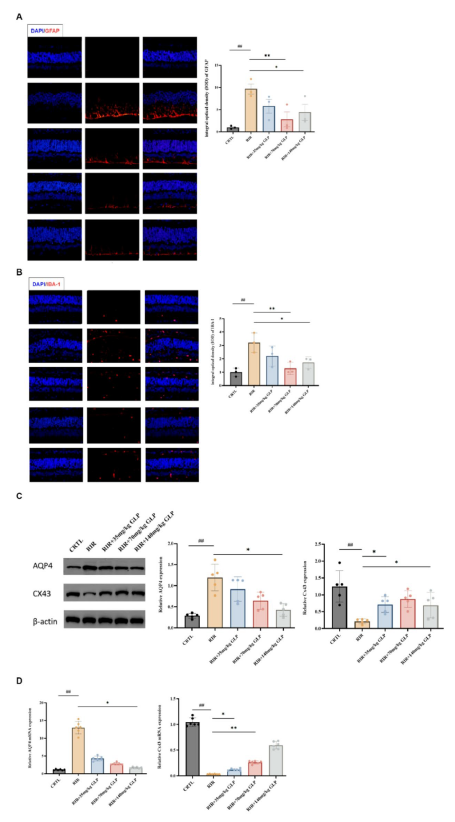 免疫荧光染色结果揭示,缺血再灌注损伤会导致视网膜星形胶质细胞标志物GFAP和小胶质细胞标志物IBA-1的免疫阳性明显增强,胶质细胞胞体增大,引发反应性胶质增生。而70 mg/kg和140 mg/kg剂量的灵芝多糖能显著下调二者表达,抑制胶质细胞过度增殖和激活,避免其对视网膜神经血管单元造成进一步损害。此外,缺血再灌注模型中视网膜连接蛋白Cx43表达下调、水通道蛋白AQP4表达上调,而灵芝多糖可剂量依赖性调节二者的蛋白及mRNA水平,恢复神经血管单元内部的物质与信息交换通道,维持视网膜微环境稳态。