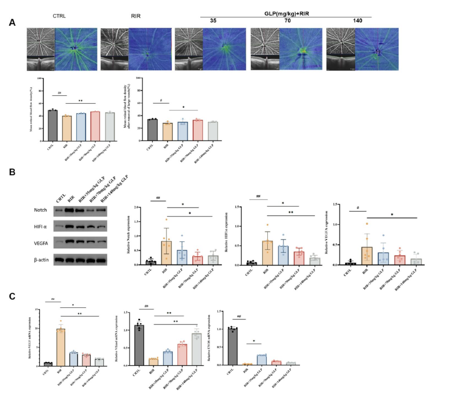 光学相干断层扫描血管造影检测显示,缺血再灌注损伤组大鼠的视网膜血管迂曲扩张,毛细血管灌注密度显著降低,平均视网膜血流密度明显下降。灵芝多糖干预后,血管迂曲程度明显减轻,70 mg/kg和140 mg/kg组的平均视网膜血流密度显著升高,毛细血管灌注得到有效恢复。分子机制研究表明,灵芝多糖能下调缺血再灌注诱导的VEGF、HIF-1α、Notch蛋白表达,同时上调VE-钙粘蛋白和内皮型一氧化氮合酶的mRNA水平,通过抑制HIF1-VEGF和Notch信号通路,稳定血管内皮细胞间的黏附连接,减少血管扩张和新生血管形成,从而保护血视网膜屏障的完整性。