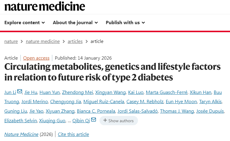 Li, J., Hu, J., Yun, H. et al. Circulating metabolites, genetics and lifestyle factors in relation to future risk of type 2 diabetes. Nat Med (2026). doi:10.1038/s41591-025-04105-8