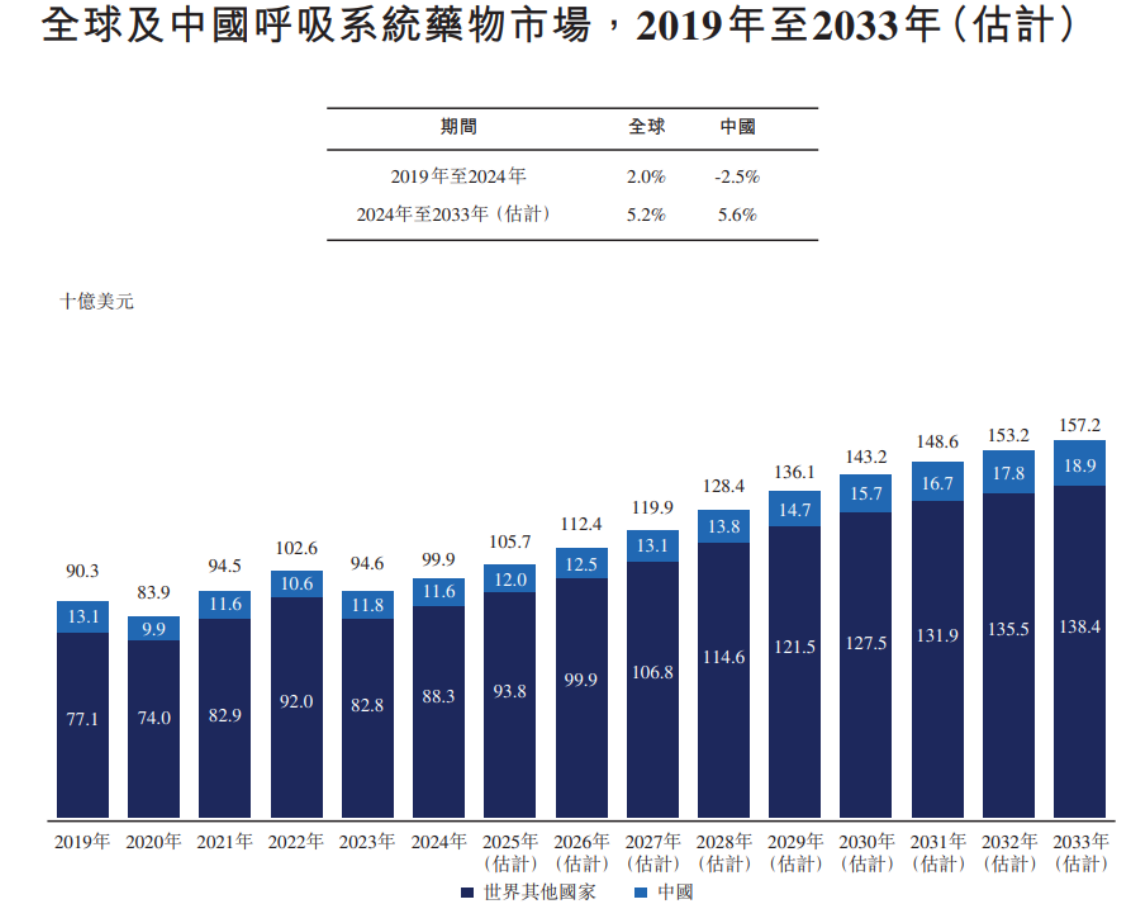 值得注意的是,慢性鼻窦炎只是桉柠蒎肠溶胶囊的适应症之一。该产品还可广泛用于急慢性支气管炎、肺炎、支气管扩张、肺脓肿、慢性阻塞性肺部疾患、肺部真菌感染、肺结核和硅肺等呼吸道疾病,亦可用于支气管造影术后,促进造影剂的排出,市场空间巨大。据弗若斯特沙利文数据,2024年全球呼吸系统药物市场规模已有约999亿美元,其中中国市场达约116亿美元,且预计将以4.5%的年复合增长率增长至2028年的138亿美元。