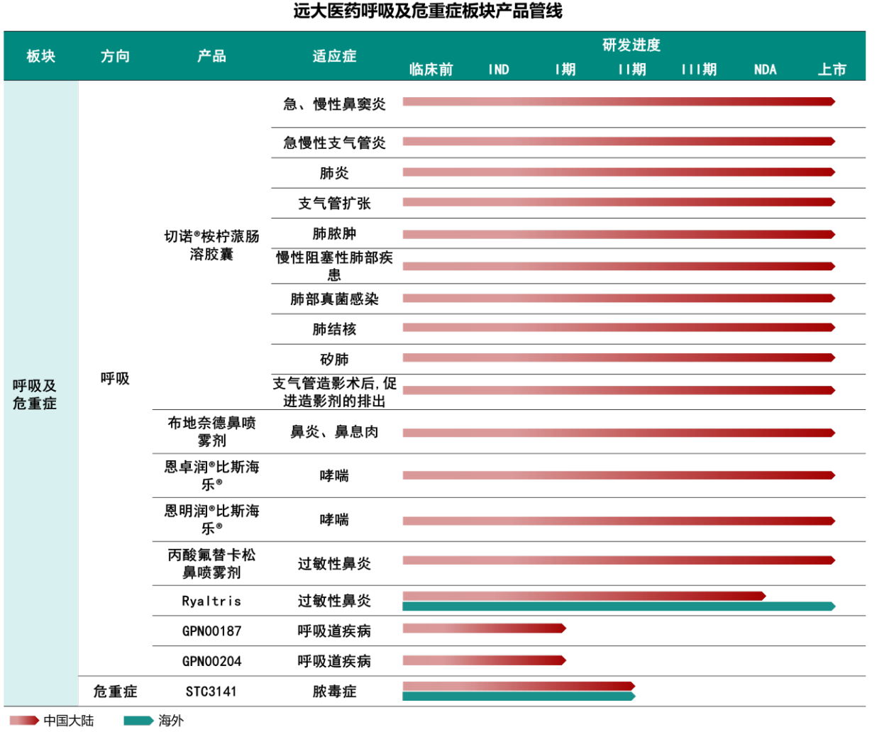 在多管线的布局下,远大医药呼吸及危重症板块的产品协同性也有望进一步增强。此次研究中与桉柠蒎肠溶胶囊联合使用的布地奈德鼻喷雾剂同样为远大医药的管线之一。该产品已在2023年11月在国内首仿上市,目前已进入快速放量阶段,有望改变同通用名产品市场上外资企业独占的市场格局。
