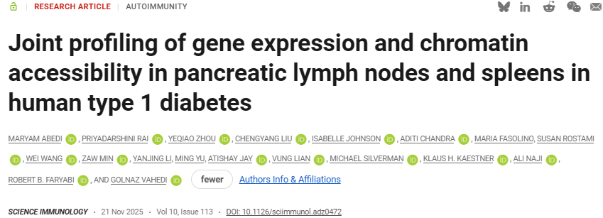 Abedi M, Rai P, Zhou Y, Liu C, Johnson I, Chandra A, Fasolino M, Rostami S, Wang W, Min Z, Li Y, Yu M, Jay A, Lian V, Silverman M, Kaestner KH, Naji A, Faryabi RB, Vahedi G. Joint profiling of gene expression and chromatin accessibility in pancreatic lymph nodes and spleens in human type 1 diabetes. Sci Immunol. 2025 Nov 21;10(113):eadz0472. doi: 10.1126/sciimmunol.adz0472. Epub 2025 Nov 21. PMID: 41270190.