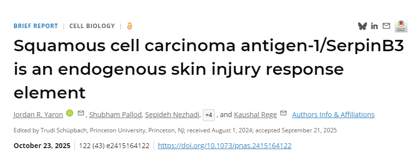 Jordan R. Yaron,Shubham Pallod,Sepideh Nezhadi, et al. Squamous cell carcinoma antigen-1/SerpinB3 is an endogenous skin injury response element. Proceedings of the National Academy of Sciences.2025, doi:10.1073/pnas.2415164122.