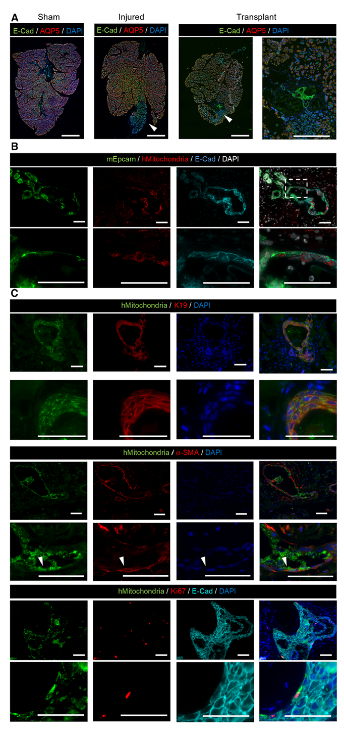 最关键的“实战测试”来了——把这张细胞片移植到唾液腺受损的免疫缺陷小鼠身上。研究团队先在小鼠的颌下腺(主要唾液腺之一)上打了个2毫米的孔制造损伤,再把细胞片“贴”在损伤处。一个月后观察发现:没移植细胞片的小鼠,损伤处的腺泡已经萎缩,导管也断了;而移植了细胞片的小鼠,情况完全不同——人来源的细胞没有“自成一派”,反而和小鼠自身的唾液腺细胞“手拉手”,一起形成了连续的导管(也就是“异种嵌合导管”)。更让人兴奋的是,这些人来源的细胞还保持着正常的“分工”:有的在导管基底负责支撑,有的在管腔侧负责运输,甚至还有能增殖的细胞(Ki67阳性),说明这个嵌合导管还能“自我维护”。偶尔还能在移植部位附近看到一小簇AQP5阳性细胞,旁边跟着肌上皮细胞,这意味着细胞片还有潜力长成能分泌唾液的腺泡。