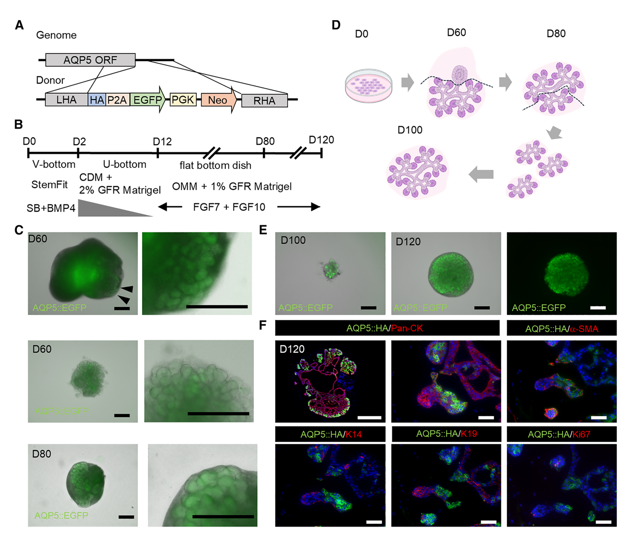 要做“细胞片”,先得有“原材料”。研究团队选择从人诱导多能干细胞入手,让它们分化成唾液腺的“雏形”(也就是类器官)。为了看清这些“雏形”的生长情况,团队还用CRISPR/Cas9技术给干细胞加了个“荧光标签”——在水通道蛋白5(AQP5,唾液腺腺泡细胞的标志性蛋白)基因旁接了绿色荧光蛋白。结果很惊喜:按照80天的分化方案培育后,这些类器官在第60天就长出了分支结构,荧光信号刚好出现在分支区域;到第80天,把这些分支结构单独分离出来,每20天“分一次家”继续培养,哪怕到了第120天,它们还能保持分支特征,里面既有能长成腺泡的前体细胞,也有支撑结构的基底细胞和肌上皮细胞,就像一群“永动机”式的“种子细胞”,能持续提供可用的“零件”。