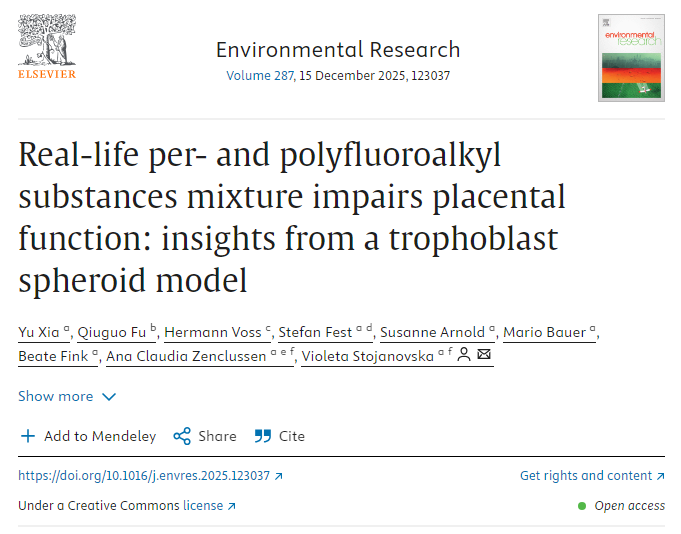 Yu Xia,Qiuguo Fu,Hermann Voss,et al. Real-life per- and polyfluoroalkyl substances mixture impairs placental function: insights from a trophoblast spheroid model, Environmental Research,Volume 287, 15 December 2025, 123037, doi:10.1016/j.envres.2025.123037