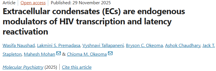 Wasifa Naushad et al, Extracellular condensates (ECs) are endogenous modulators of HIV transcription and latency reactivation, Molecular Psychiatry (2025). DOI: 10.1038/s41380-025-03354-w.