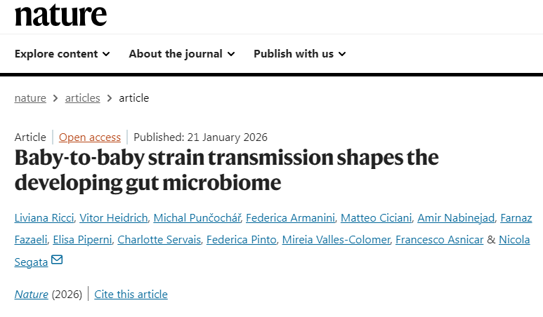 Ricci, L., Heidrich, V., Punčochář, M. et al. Baby-to-baby strain transmission shapes the developing gut microbiome. Nature (2026). doi:10.1038/s41586-025-09983-z