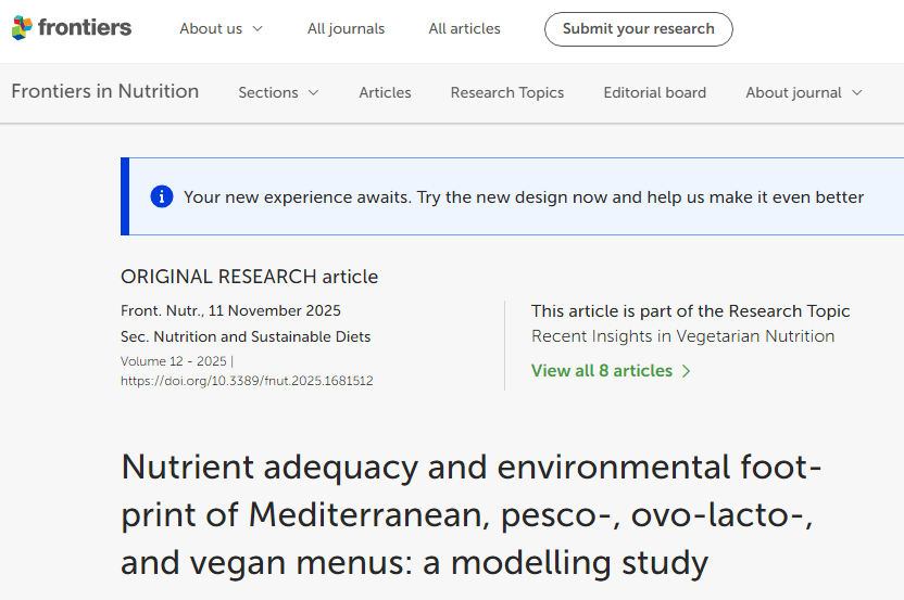 Ángela Alcalá-Santiago,Noelia M. Rodríguez-Martín,Eduardo Casas-Albertos,et al. Nutrient adequacy and environmental foot-print of Mediterranean, pesco-, ovo-lacto-, and vegan menus: a modelling study. Frontiers in Nutrition,2025, doi: 10.3389/fnut.2025.1681512.