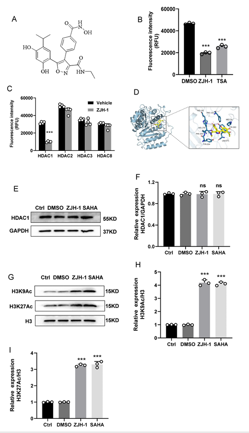 研究首先关注ZJH-1对HDAC1的靶向专一性,生化分析发现它对HDAC1的抑制能力特别强,能让PC3前列腺癌细胞中HDAC1的催化活性下降68%,但对HDAC家族的其他成员比如HDAC2、HDAC3、HDAC8,几乎没有抑制作用。从分子层面看,ZJH-1和HDAC1的结合能力也很稳定,结合自由能低至-9.5 kcal/mol,靠疏水作用和氢键牢牢“固定”在HDAC1的活性口袋里。更重要的是,它只影响HDAC1的功能,不会改变HDAC1蛋白本身的表达量,这就减少了对正常细胞的误伤。同时,ZJH-1还能让PC3细胞中组蛋白H3的K9、K27位点乙酰化水平明显升高,为后续抑制癌细胞增殖打下基础。