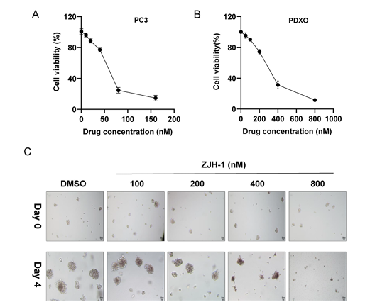 在检测ZJH-1杀灭癌细胞的能力时,它的表现也很突出。对PC3前列腺癌细胞,只需要65纳摩尔的浓度就能达到半数抑制效果(IC₅₀=65 nM);即便面对更贴近临床实际的患者来源异种移植类器官(PDXO)——这类模型通常比实验室培养的细胞系更难被药物作用,ZJH-1也能发挥效果,半数抑制浓度是345 nM,高浓度时甚至能让类器官的结构直接崩解,显示出很强的细胞毒性。