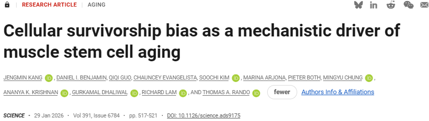 Jengmin Kang et al, Cellular survivorship bias as a mechanistic driver of muscle stem cell aging, Science (2026). DOI: 10.1126/science.ads9175.