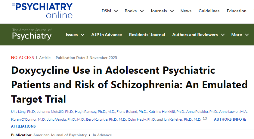 来自爱丁堡大学等机构的科学家们通过研究发现,常用抗生素多西环素或能显著降低青少年精神科患者日后发展为精神分裂症的风险。