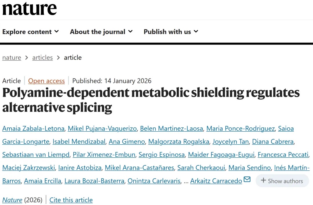 Nature:首次揭示多胺依赖代谢屏蔽调控选择性剪接,建立代谢重编程与RNA剪接新联系