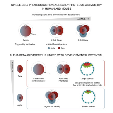 该研究通过单细胞多重质谱技术分析小鼠和人类胚胎单个卵裂球的蛋白质组差异,首次揭示一种由受精作用引起的胚胎早期发育的蛋白质组非对称性且可以传递至子代卵裂球,并证实β亚型卵裂球具有更强的发育潜能。