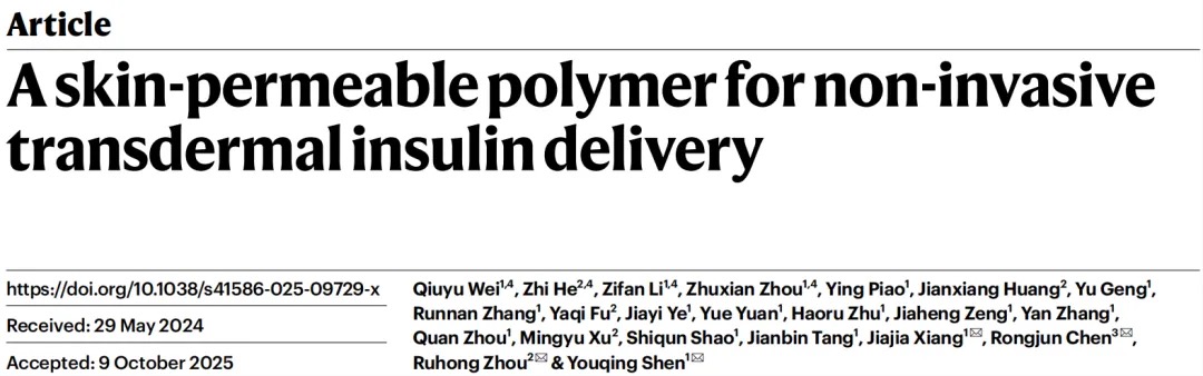 Nature:申有青/周如鸿/陈荣军/相佳佳合作开发可经皮吸收的高效胰岛素递送新材料
