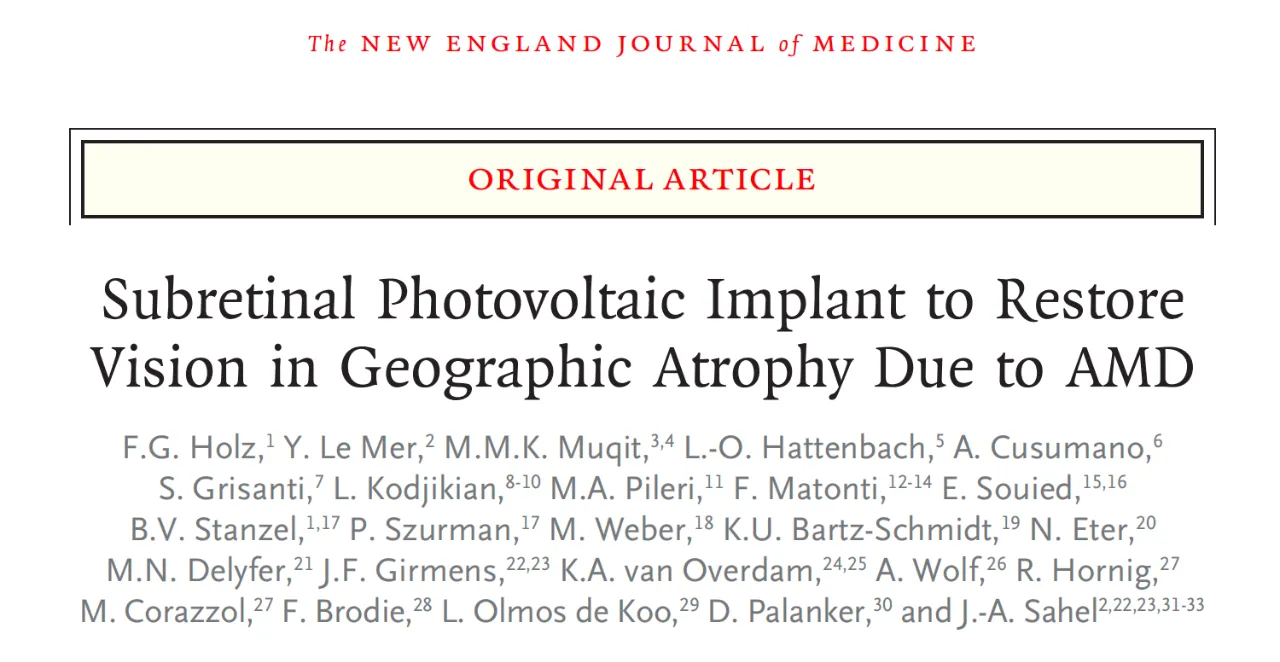 这项突破性研究通过向视网膜下植入一种微型、无线光电系统——PRIMA(光电视网膜植入微阵列),其尺寸仅为 2 毫米 × 2 毫米,厚度仅为 30 微米,通过手术植入视网膜下方,以替代丧失的感光细胞。