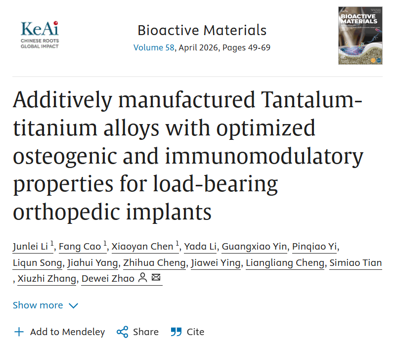 3D打印钽钛合金登Bioactive Materials:承重骨科植入物实现“力学+成骨+抗炎”三重 buff,12周新骨长37%