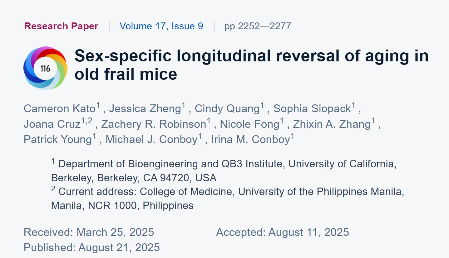 给相当于人类75岁的老年虚弱小鼠用催产素加Alk5抑制剂,雄鼠额外寿命延长73%且更健康,雌鼠没这效果但生育力改善,这组合有临床潜力,性别差异值得深究。