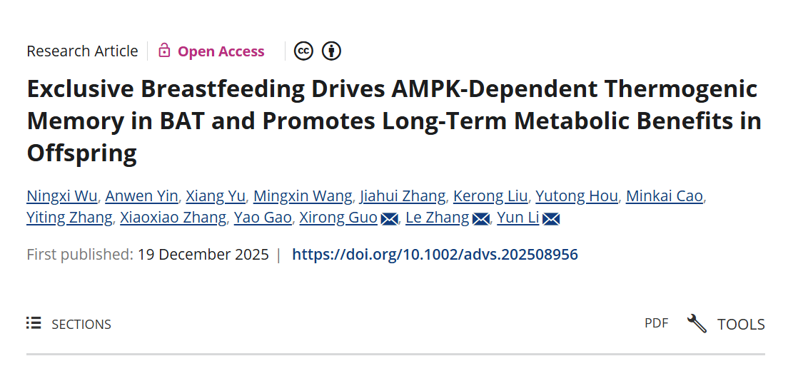 纯母乳喂养通过母乳外泌体中的miR-125a-5p靶向HIF1AN激活AMPK/α-酮戊二酸轴,在棕色脂肪形成持久产热记忆,为后代提供长期代谢保护。