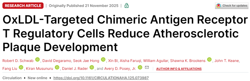 Circulation:新型CAR-T细胞疗法可将动脉粥样硬化斑块减少70%