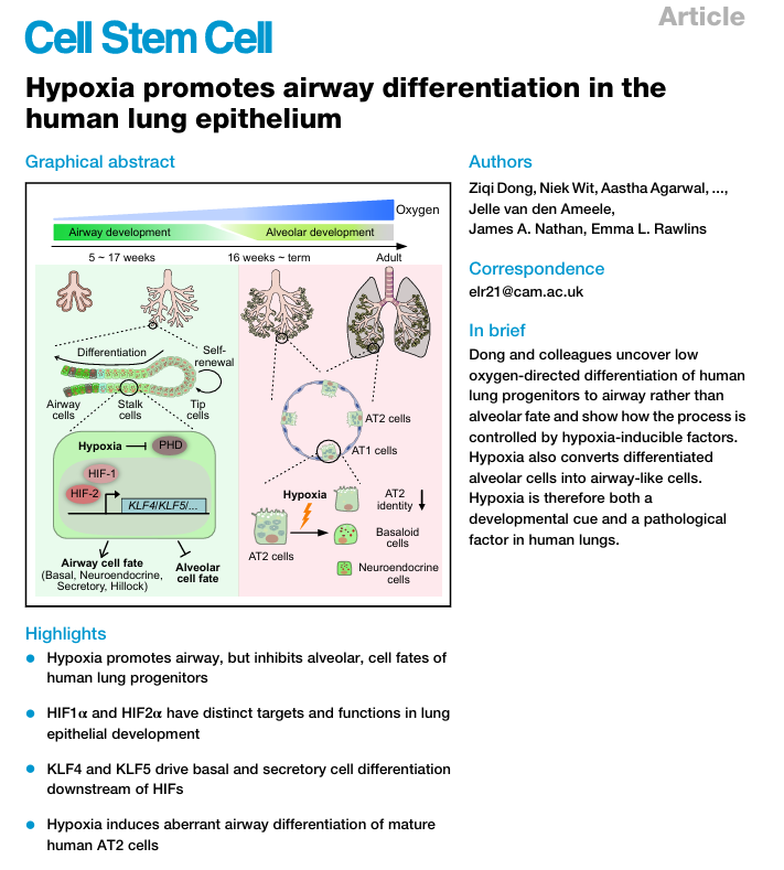 研究证实缺氧会推动人类肺祖细胞分化为气道细胞、抑制肺泡形成,HIF1α和HIF2α通过调控KLF4/KLF5实现这一过程,甚至能让成熟AT2细胞转变成气道样细胞。