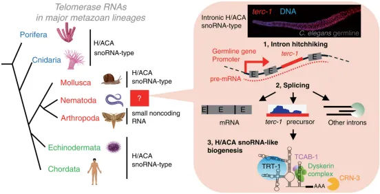 实验表明,在缺乏terc-1的线虫中,端粒每一代都会变短,在15代之内,这些线虫就会灭绝。将terc-1插入到在生殖细胞中表达的其他基因的内含子中,培育出的线虫则拥有正常的端粒,并且没有灭绝。