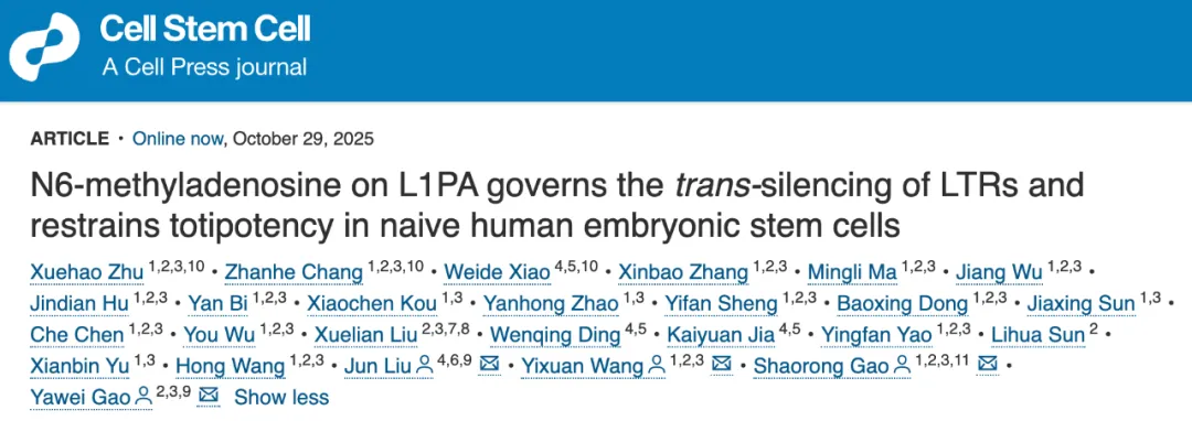 Cell Stem Cell:同济大学高亚威/高绍荣/王译萱团队揭示m⁶A修饰限制人类胚胎干细胞全能性的机制