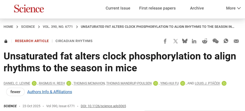 《科学》:膳食脂肪重塑昼夜节律!加州大学科学家发现,饮食中不饱和脂肪酸比例会影响昼夜节律,是人体生物钟与季节匹配与否的关键