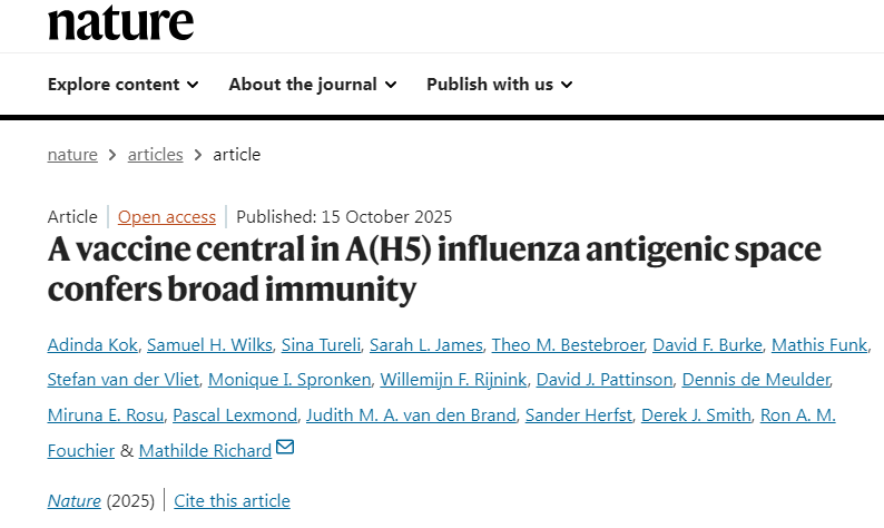 来自荷兰伊拉斯谟大学鹿特丹医学等机构的科学家们通过研究成功开发出一种位于A(H5)流感病毒抗原空间中心的疫苗,其或能提供广泛的免疫保护。